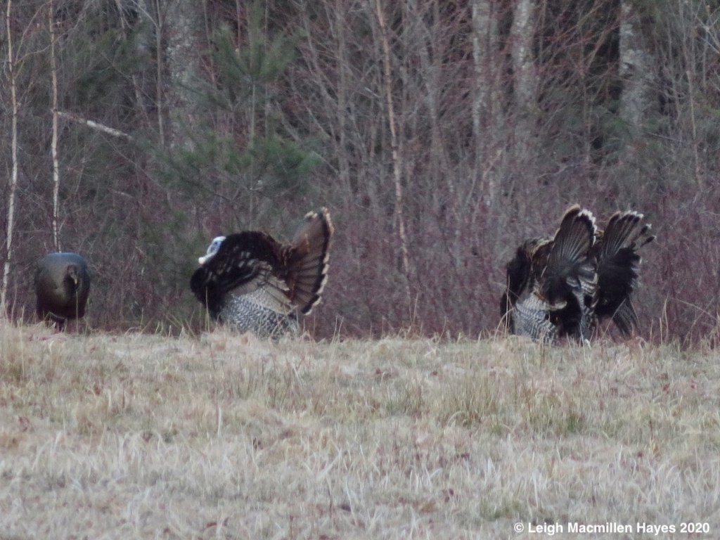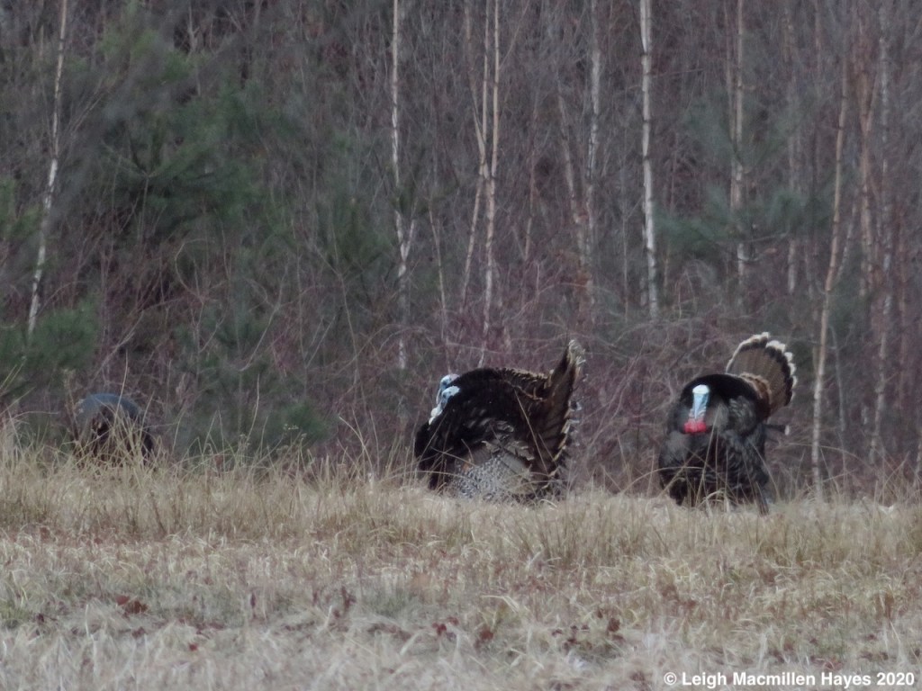In turkey terms, to display means standing upright with tail feathers fanned out, wings dragging, and fleshy wattles on the neck, throat, and snood above the beak swollen and bright red. So, to the latter, watch their wattles and snoods as Jen the hen moved back and forth across the field like a tease.