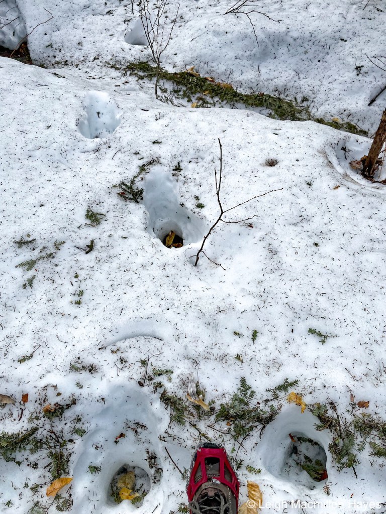 That said, not only were we gymnasts, but we also had to pull some ballet leaps out of the daypack; sometimes the stream crossings like this one, were obvious, but other times we had to guess where the softest spot might be and try to jump to the other side without crashing through the snow bridge. Success wasn’t always on our side.