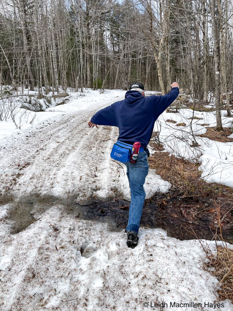 For his birthday in the fall, as you may recall, I gave my guy a baker’s dozen list of geocaches to locate in the wilds of Maine and New Hampshire. Prior to this past weekend, he’d located twelve with one left–burning a bit of a hole in his pocket because we thought we’d get there on Thanksgiving, but rain changed that plan. And then winter happened and we knew the journey would require more time because gates on the Forest Road would be closed and we’d have to trek a longer distance. With the dawn of spring, however, he thought we should take our chances. Oh, we’d still have a ways to hike, but thankfully it’s light later and so we had that on our side.