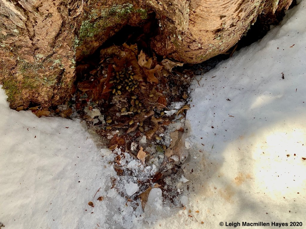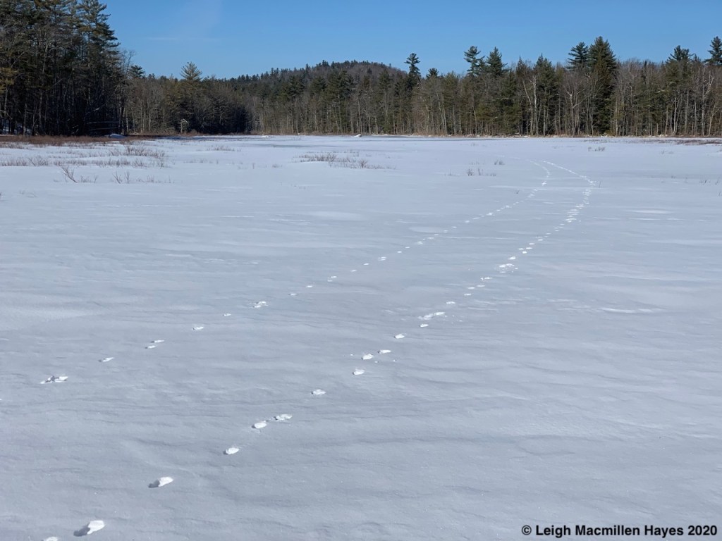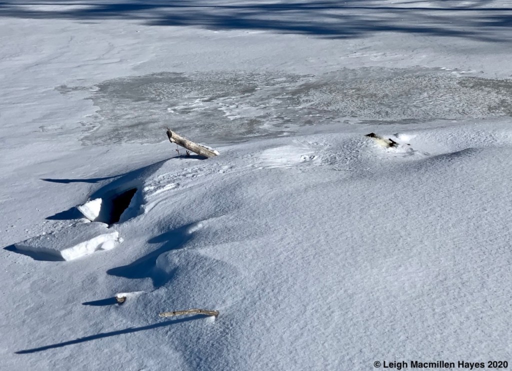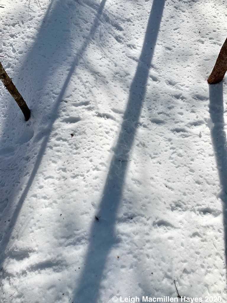 After circling the Loop Trail and noting tons of apple-filled coyote scat plus coyote, bobcat, red fox, and turkey tracks, we followed the Moose Loop aptly named for the moose that journeyed that way frequently, but also featured coyote and fox tracks. At Moose Bog, we again met the aphid poop-eating fungus and so the comparison began. Black Knot encircles the twig, while the Poop-eating fungus doesn’t. And Black Knot features a beady construction, while the Poop-Eaters are much lacier in looks, rather like the wooly aphids who offer their poop for consumption. The Black is much firmer, and Poop-Eater much more crumbly when touched. Either is interesting and . . . both offer opportunities to wonder.