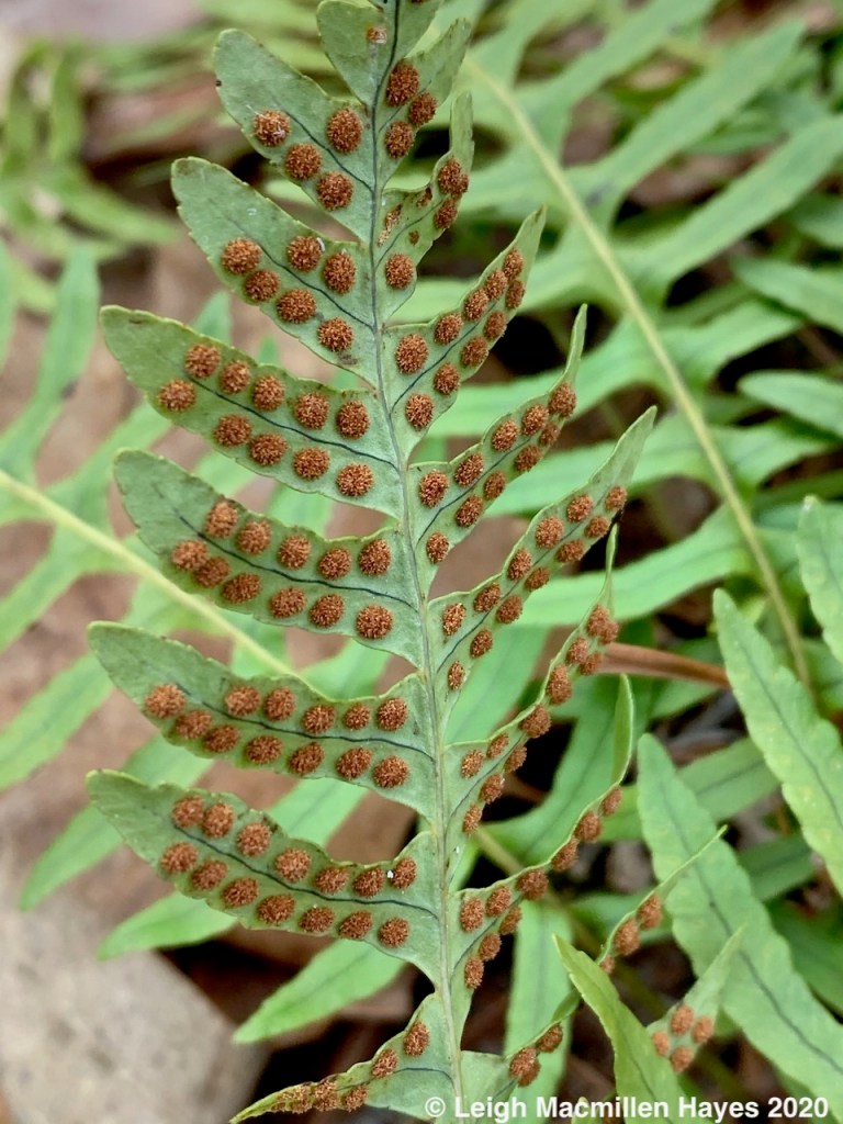 I did hear the hushed groans when I turned it over, but what could I say? I can’t resist checking to look at the underside. Like little pompoms, the organs or sori that housed the dust-sized spores or sporangia are arranged so neatly in two rows upon each leaflet. In their old age, the sori of these common polypody are orange-brown.