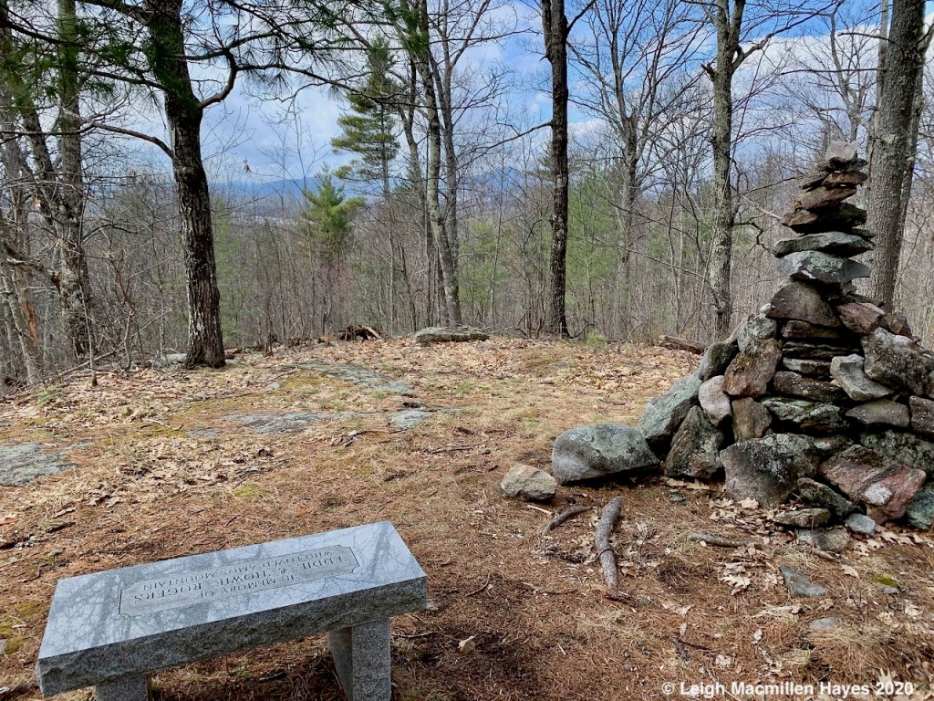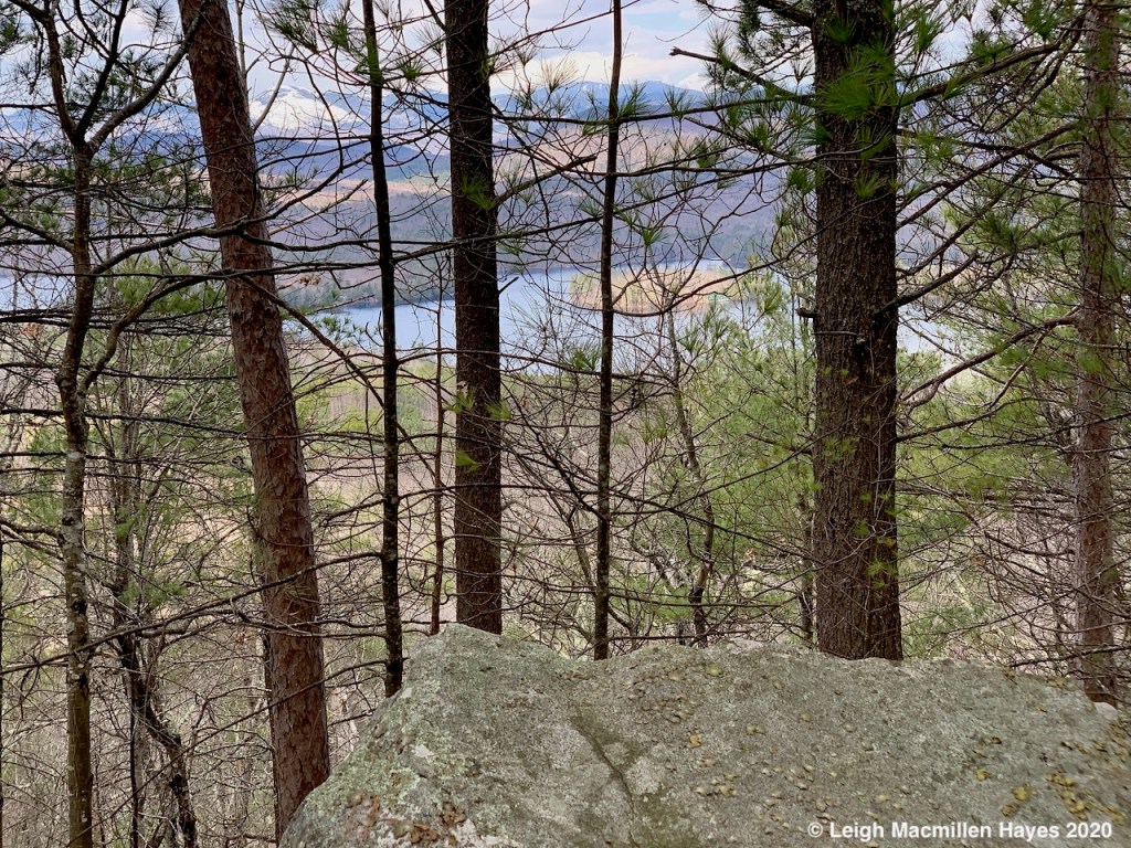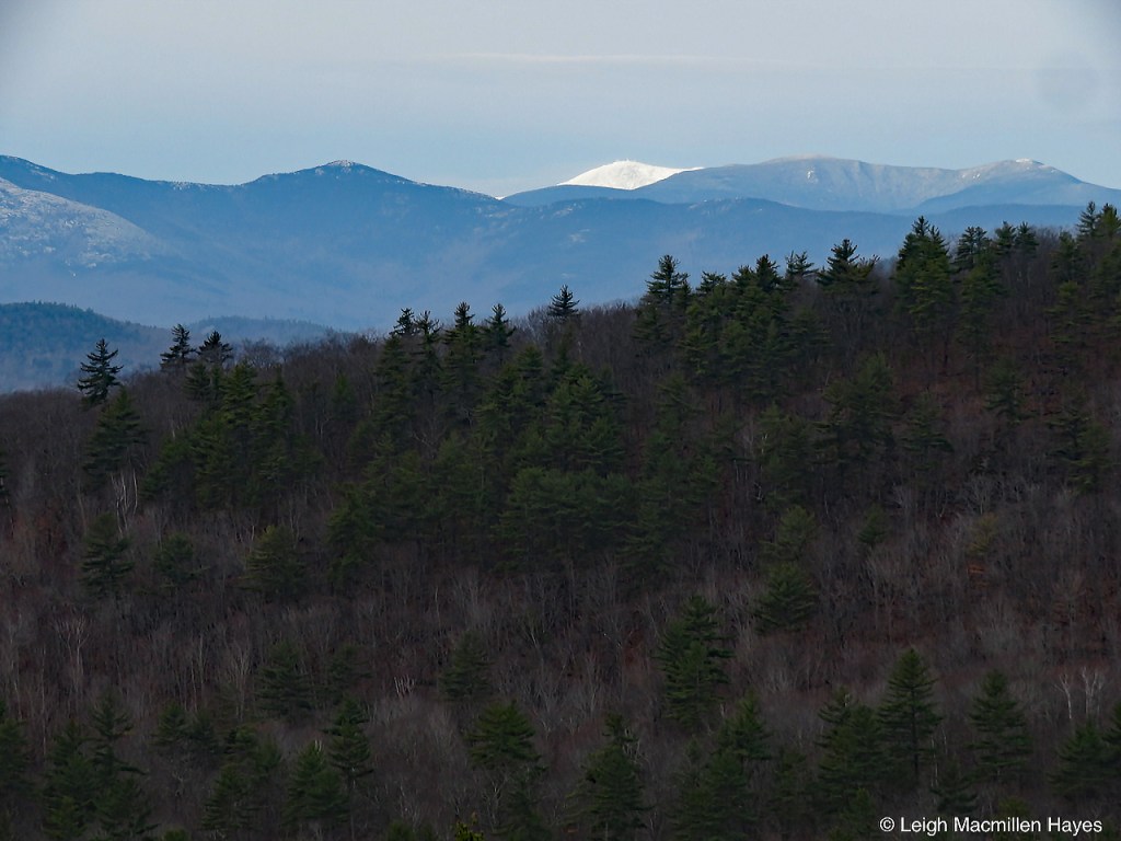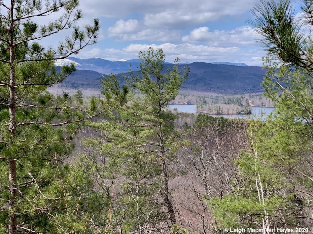 At the intersection with the Amos Mountain Trail, our route crossed over and we continued on to the lookout point where the Balds to the left, Mount Washington a wee white pyramid in the background, and Kezar Lake below held our focus.