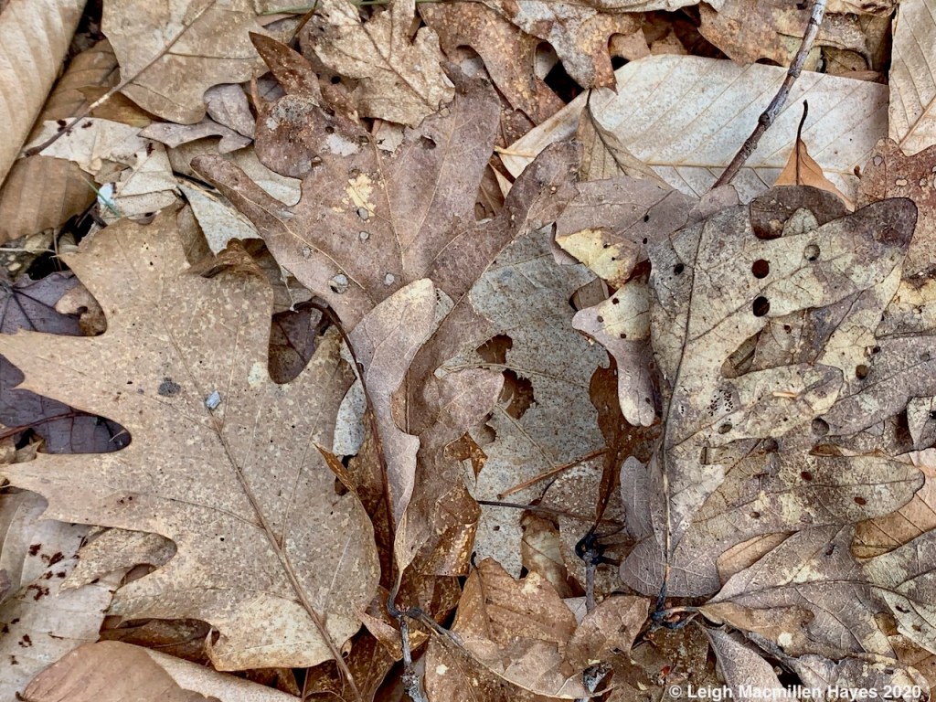 The leaves below also defined the new story, with red oak’s bristly pointed lobes on the left and white oak’s rounded lobes to the right.