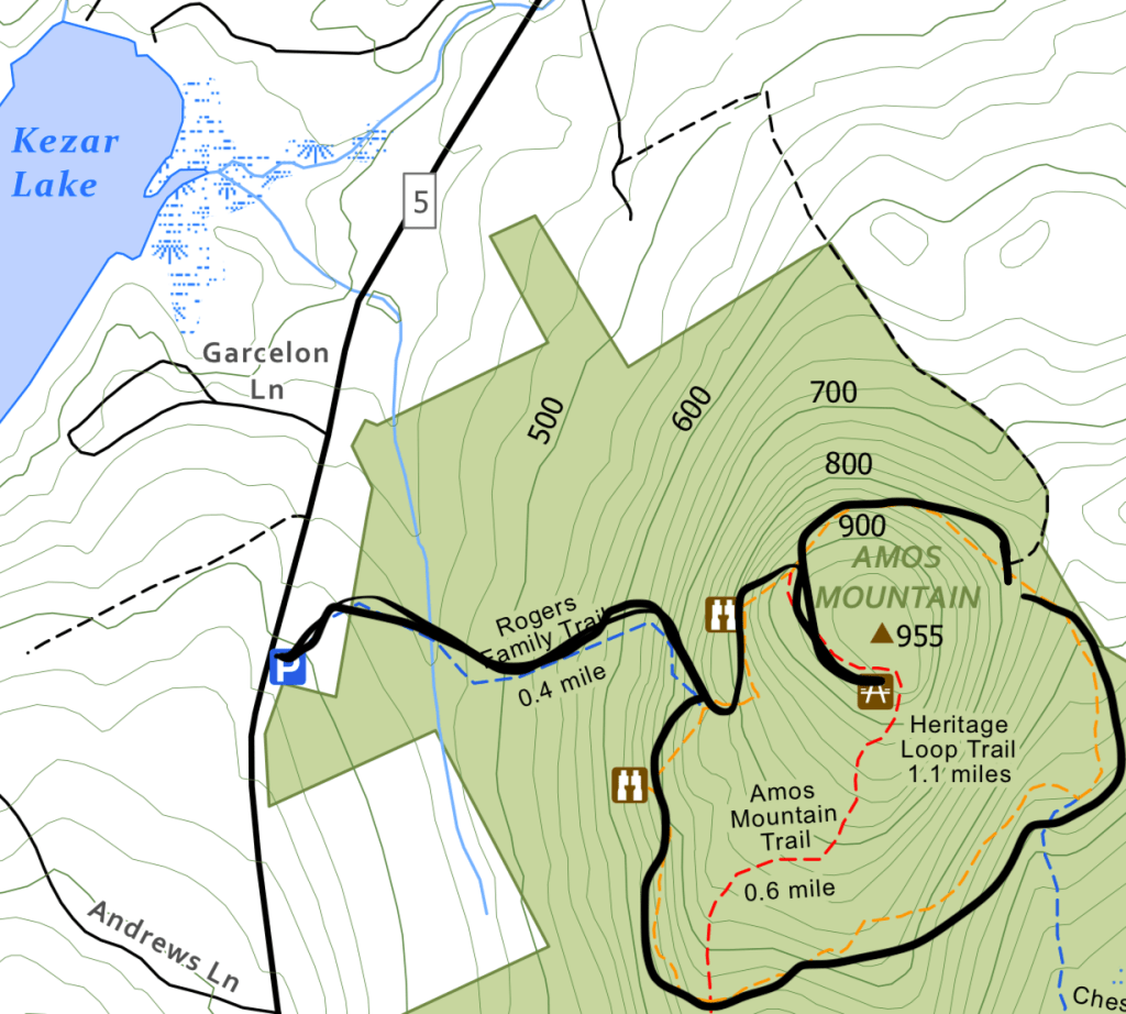 As I showed you in the parking lot, our plan was to begin on the Roger’s Family Trail and then circle around on the orange Heritage Loop Trail with a side trip to the summit of Amos Mountain in the midst of the journey. You all agreed that it sounded like a great plan.