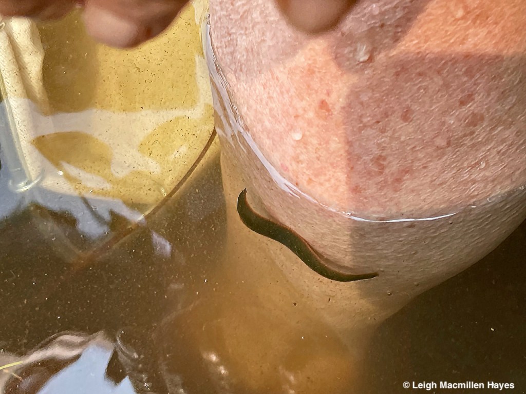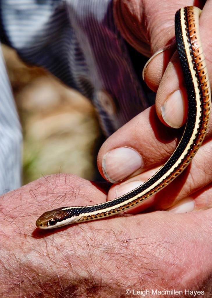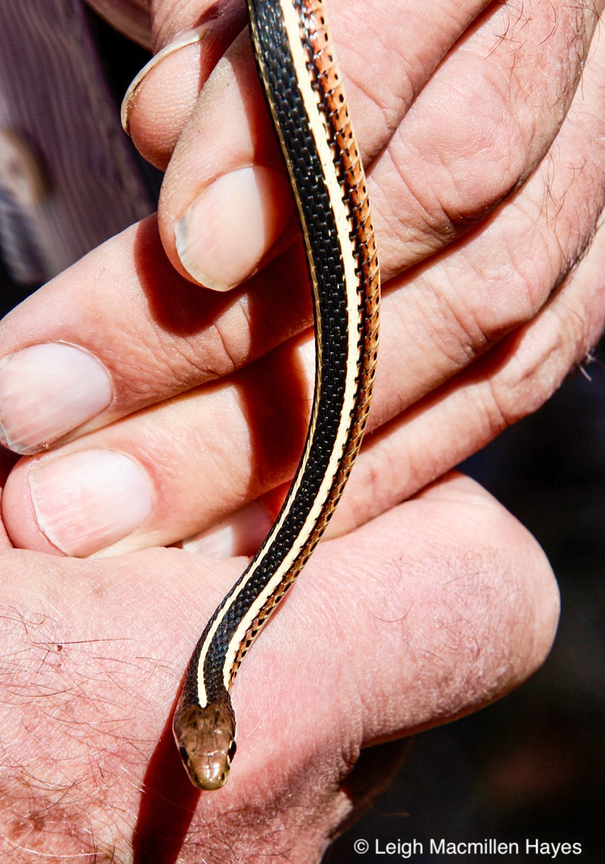 And though it would be easy to mistake for a Ribbon Snake because of the buff-colored lines on its back, it isn’t. This snake has a stockier body and wider, olive-green head. Two other differences include dark marks along the edges of each labial (lip) scale, and of equal importance, no defined white spot in front of each eye. Oh, it’s pale yes, But scroll back up to the photo of the Ribbon Snake and see how they differ.