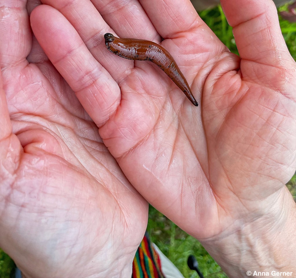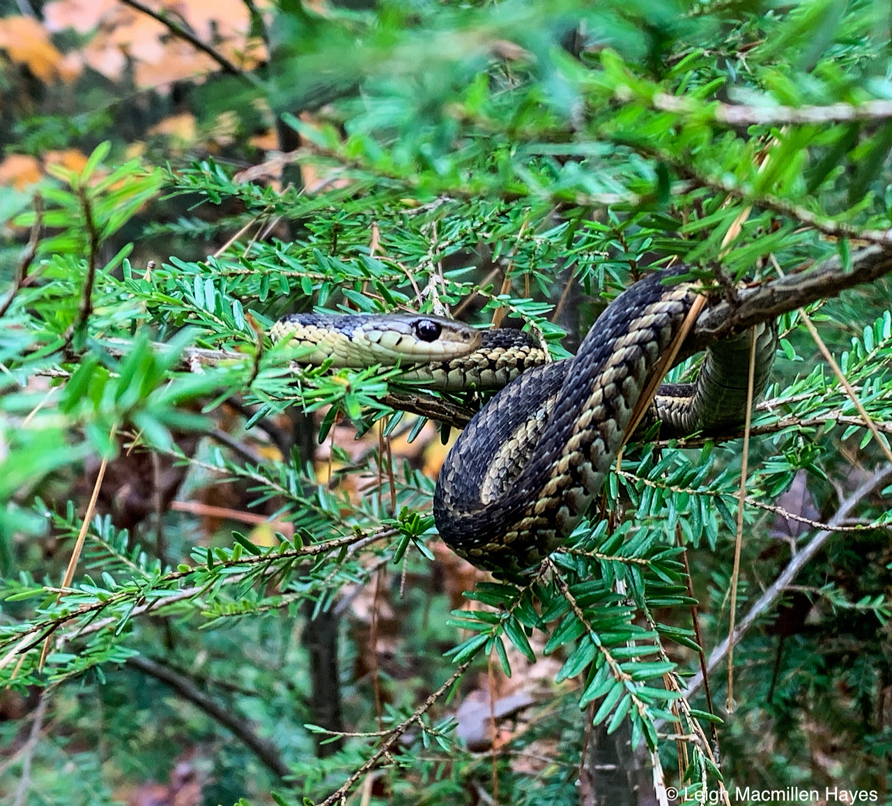 So here’s the most exciting news of the day. Yesterday, before meeting with the same afterschool group as last week, I pre-hiked the trail. Suddenly, I walked into web as thick and sturdy as a fish net and bounced back with surprise. When I looked for the creators, I found three small spiders, who immediately went into action to fix what I had just ruined. I spent a few minutes watching them, then turned my attention back to the trail and just off to the left I spied this Garter Snake at eye level in an Eastern Hemlock sapling.