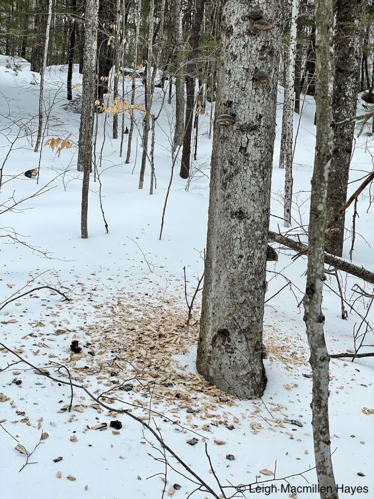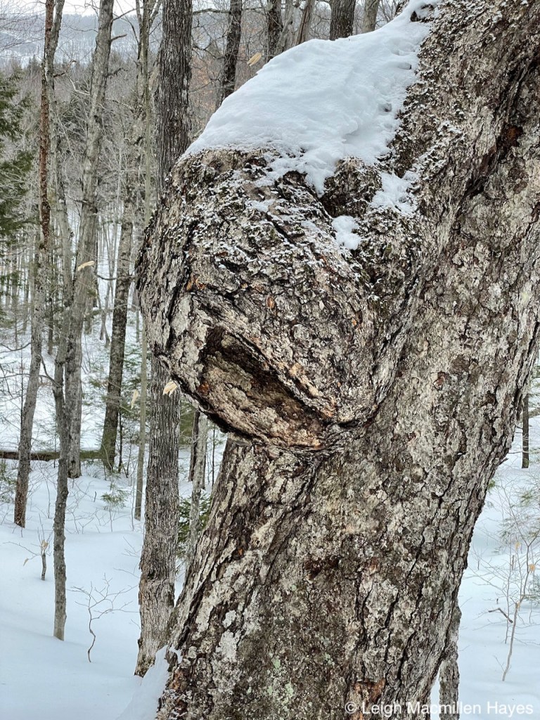 The Bobcat prints frequently led to buried rocks or stumps where it could pause and look out on the scene in hopes of finding more prey. The thing is, this has been a tough winter in some places such as Oxford County, Maine, because we’ve been through two summers of a major Spongy Moth outbreak and the trees had all they could do to put out a second set of leaves after the first set had been consumed. That means that there isn’t a lot of fruit in the forms of cones and beech nuts available, thus there aren’t a lot of rodents, a prime source of winter food for predators such as these.