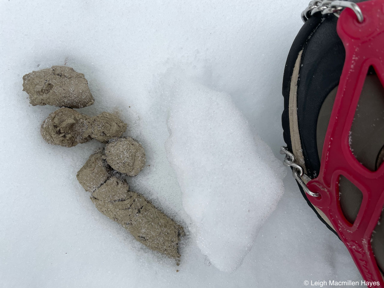 And so it was when we first encountered what could have been a hair ball of sorts and then discovered this hair-filled scat about a yard beyond. And near it another “hair ball.” Based on size and structure we determined the scat belonged to a bobcat, and thought that the hair balls made sense as maybe the cat had to cough up some of the hair of the mammal consumed. What did it eat? Well, we know both snowshoe hare and deer frequent this place and so it could have been either.