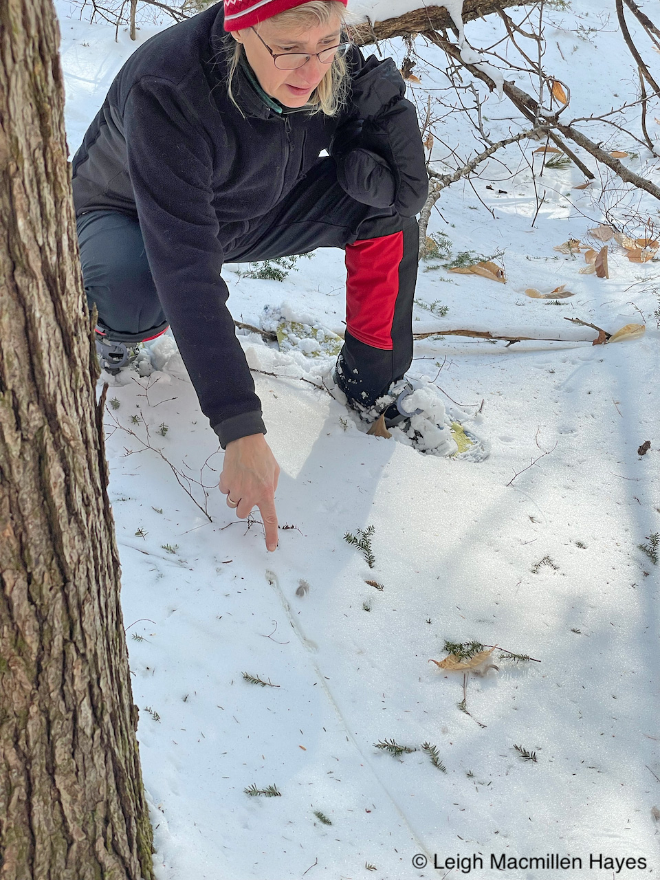 But then . . . our job became more difficult. By the size of the stride of the next mammal we followed, our measurements came up with a toe-to-toe length of 14 inches repeatedly. But the print looked like that of a critter with a much longer stride–20 – 22 inches typically. We followed it for a while, and kept looking for a perfect print, which wasn’t easy to find given that Saturday’s storm, followed by melting temperatures and lots of wind since then, created a lot of tree plops (aka ploppage in our group) and melt out so there were nothing clear to read.