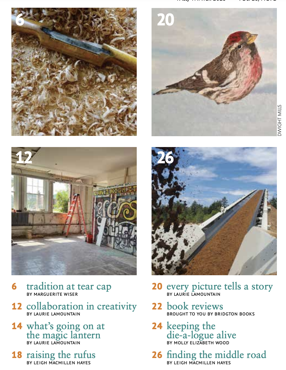 Editor and publisher Laurie LaMountain has written about Ian Factor’s studio in Bridgton in a previous issue, but now Ian has taken his work a step further and you can read all about what he’s bringing to Fryeburg Academy students in Fryeburg, Maine.