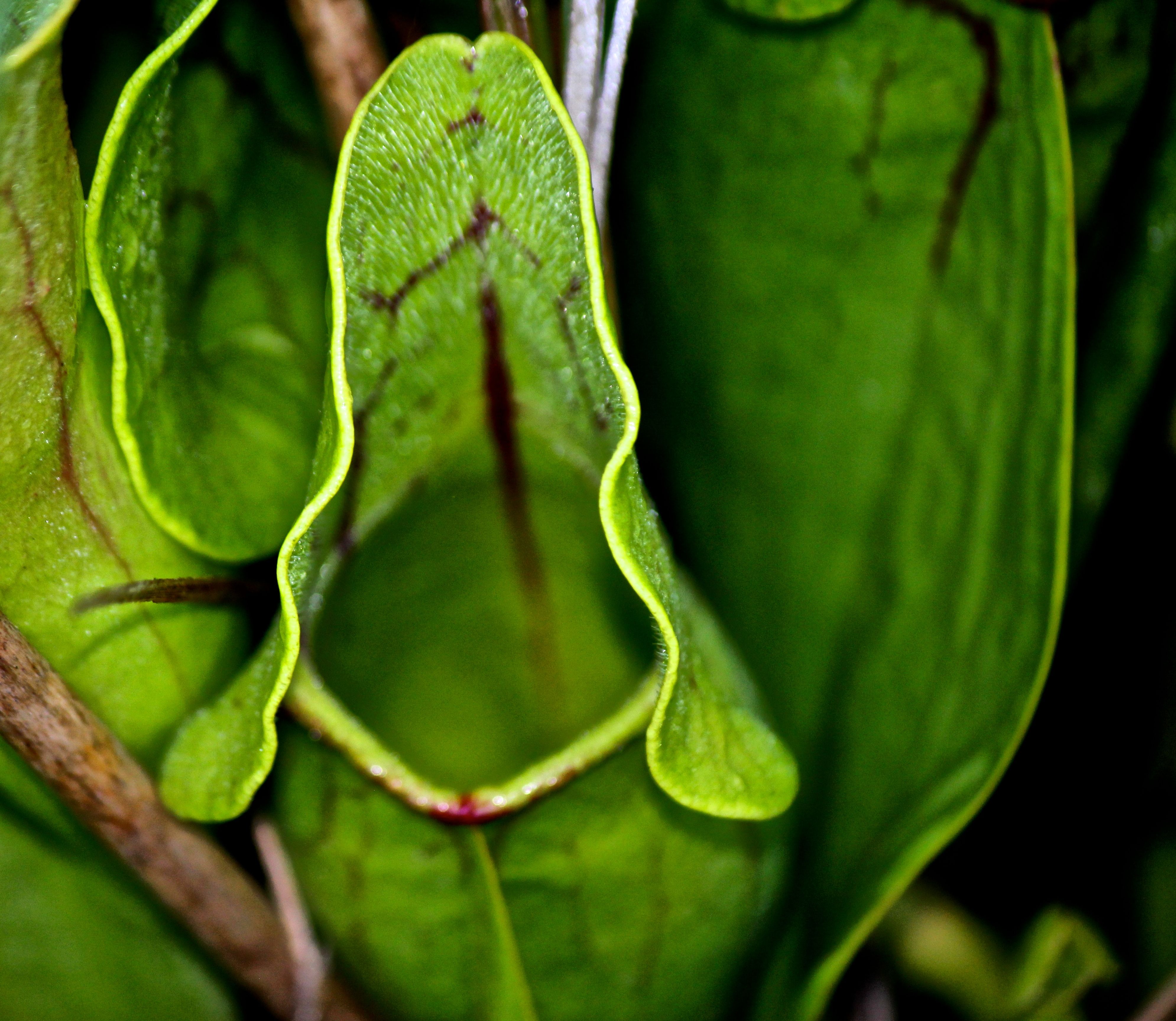 The carnivorous pitcher plant obtains nitrogen and phosphorus by eating insects. Its oddly shaped leaf forms a unique pitcher partly filled with water and digestive enzymes. The spout is a hairy landing platform for insects attracted by its red venation and nectar glands. Imagine this: An insect crawls to the edge of the leaf, aka pitcher, slips on the downward-sloping hairs and plunges into the liquid below where enzymes and bacteria break it down. Any chance for escape are zapped by those stiff hairs. Oh my.