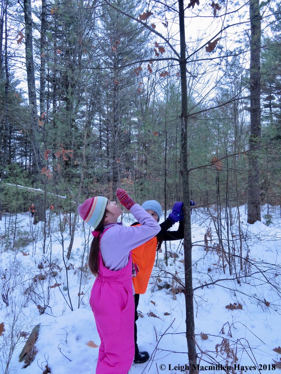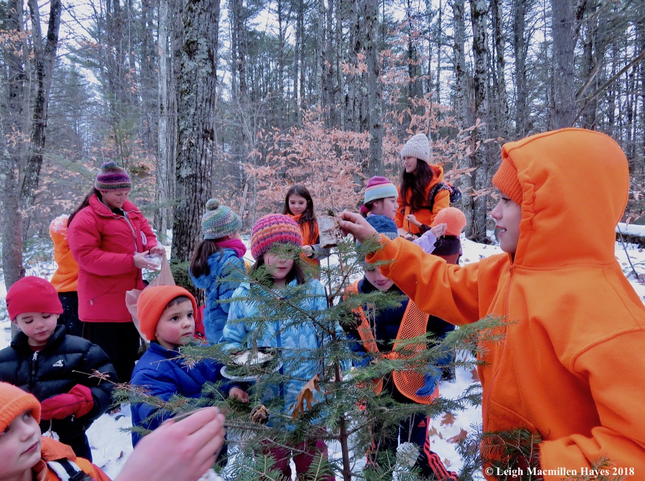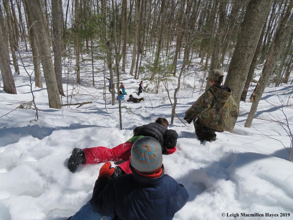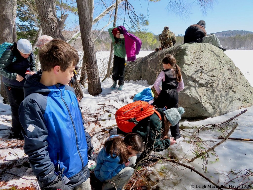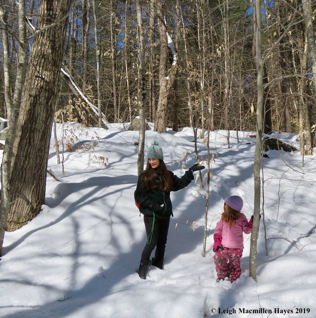 Finally, we all departed and I was only ten minutes late for my quick meet-up, after which I headed back down Route 5 to reconnect with my favorite little naturalists at the Kezar River Reserve across from the Wicked Good Store. There’s a tape across the road, which I suspect was put in place by the local snowmobile club when the ice was questionable on the river, but it remains, which given the recent rain is probably a good thing. We’ll take it down soon, but it has prevented the road from becoming more rutted than normal.