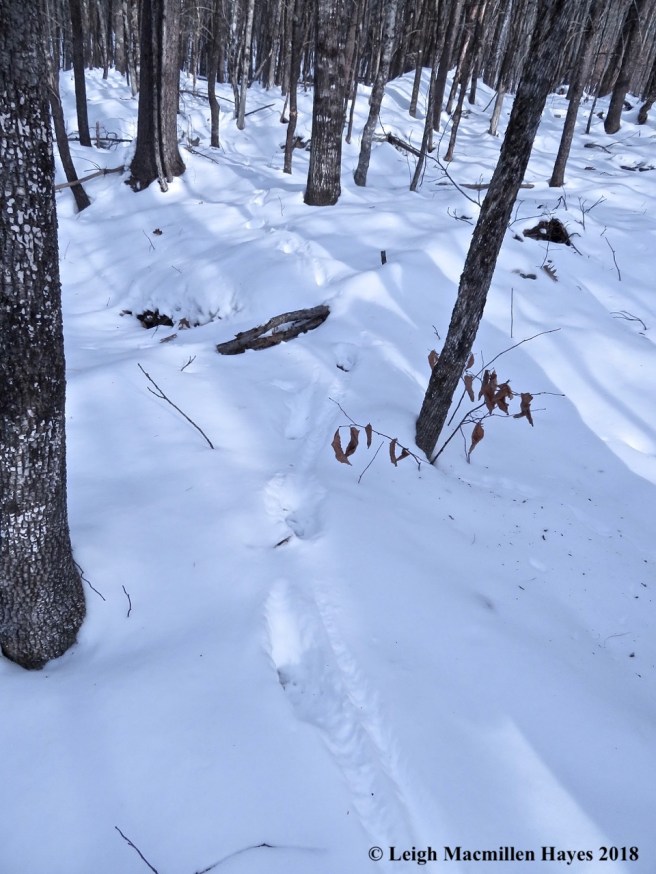 There are no trails yet and so after parking, we followed the road back a ways to the area of our winter expedition. And what to our wondering eyes did we spy on the road? Moose prints! One should always look through a magnifying glass to make certain the ID is correct. Wes confirmed our suspicion.