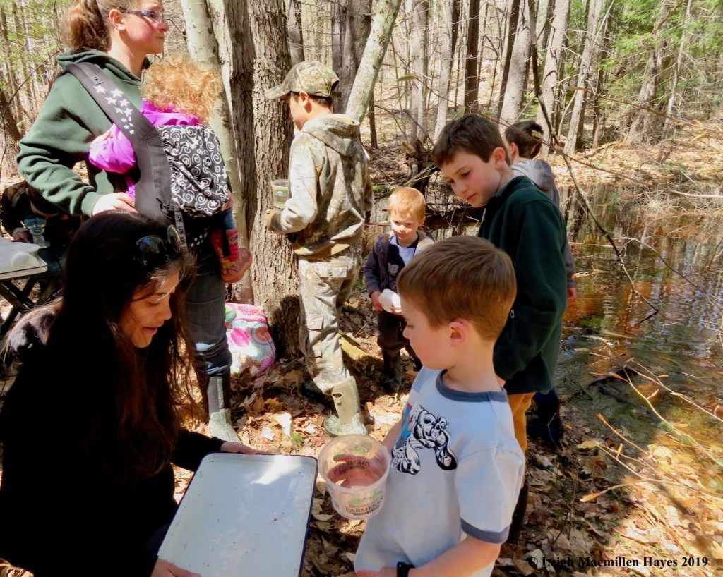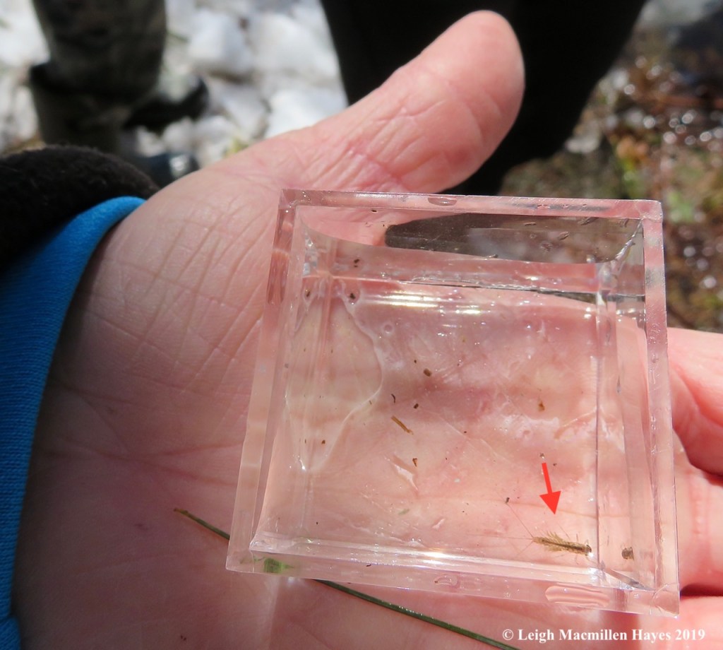 We found sitting water and running water and began to wonder about the wetland and whether what we thought might be a vernal pool really was, for we knew that a v.p. shouldn’t have an inlet or outlet. As the first dips of the day were made, black flies began to swarm around us. We hoped to pick up their larvae in the moving water, but instead we found many springtails.