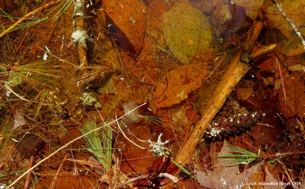 We checked out “pool” after “pool” and found not one egg mass (except for a false start that fooled us momentarily), which rather disappointed us. Were these really vernal pools? We suspected so as they were shallow and looked like they’ll dry up in the summer, if not before, plus they supported no fish. Were they significant vernal pools? Definitely not. To be a significant vernal pool, the body of water must contain one of the following obligate species: 1 fairy shrimp or 10 blue-spotted salamander egg masses or 20 spotted salamander egg masses (yellow spots) or 40 wood frog egg masses. Fairy Shrimp? No. Salamander egg masses? No. Frog egg masses? No.
