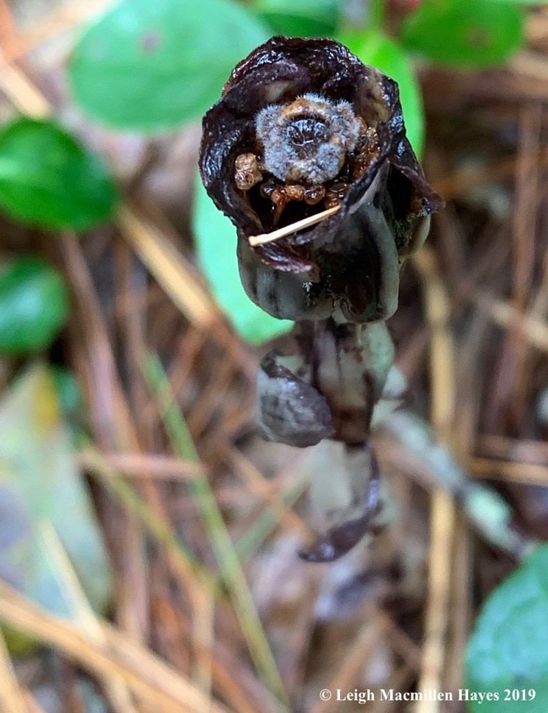 When the flower of this translucent plant turns upright, it has been fertilized and a woody capsule containing its seeds will form: Indian Pipe.