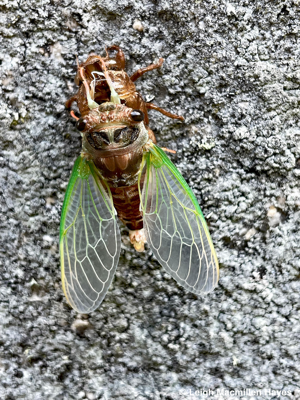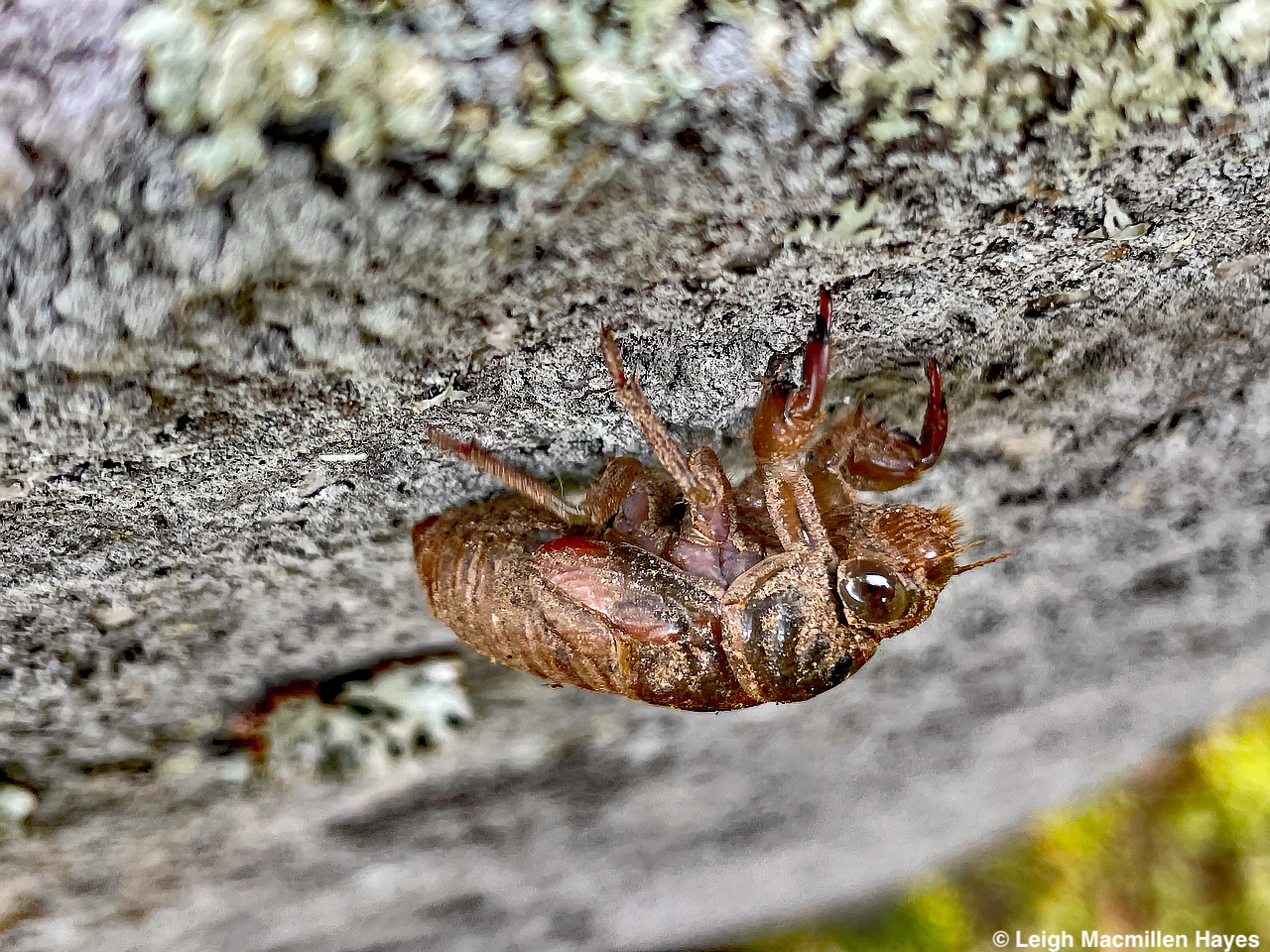 Note that the proboscis is tucked under their bodies, as it won’t be needed until these cicadas reach the tree tops. Once up there, where I won’t be able to spy them, males will produce the droning whirr of a song we all associate with summer by using their tymbals or paired membranous structures in their abdomens that vibrate through muscular action–it’s this song that attracts females. After mating, the female lays her eggs in slits she makes in twigs. The young nymphs hatch, fall to the ground, burrow underground and feed on sap from roots for a year or two or three.