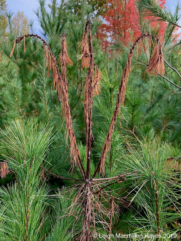 A couple of trees, however, showed off the efforts of a White Pine Weevil. Brown, wilted main shoots (terminal leaders) featured tips curved into a shepherd’s crook. More on that later.