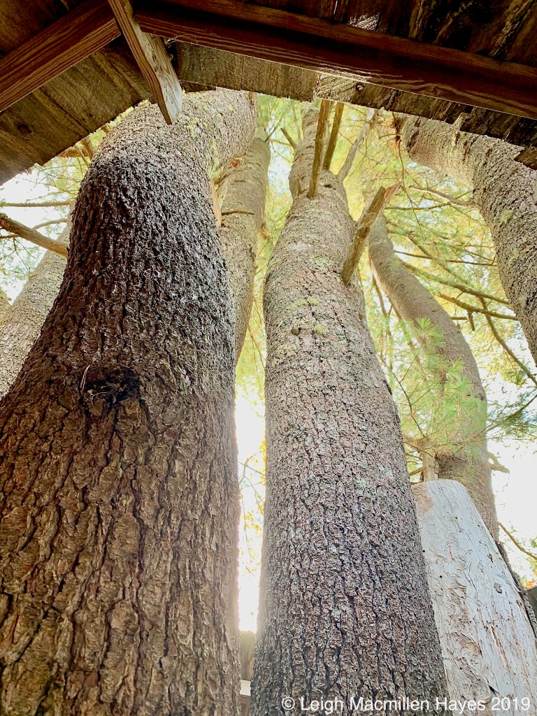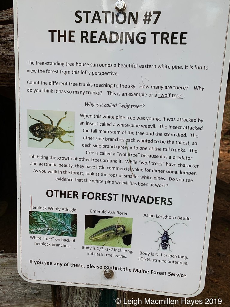 It’s known as the Reading Tree, but it’s more than that, which the interpretive sign explains. Remember that White Pine Weevil damage we saw at the log landing? Well, the White Pine that the treehouse surrounds was a long-ago weeviled tree. When a pine is weeviled, the leader shoot dies and the whorl from the previous year take on the task of growing skyward.