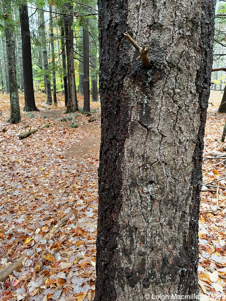 I followed the main logging trail for a while and then turned off to explore unknown territory. But . . . before turning, it was the maroonish color of the cherry bark that warranted attention. And the lenticels–raised, elongated and horizontal imprinted on my brain.