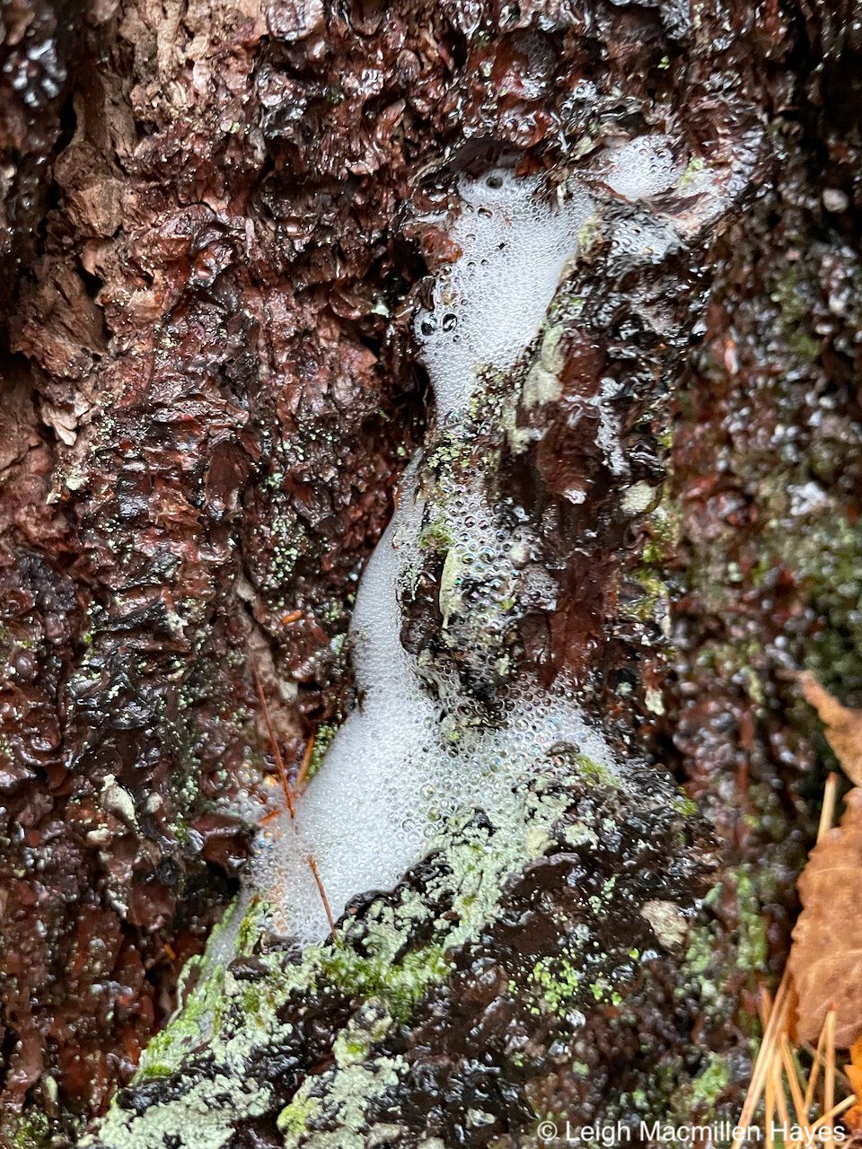 While there were specks of shield lichens on a young maple tree, the variety of flattened crustose lichens covered so much of the trunk that it was almost difficult to distinguish the bark color. The mosaic pattern suggested a painting–naturally.