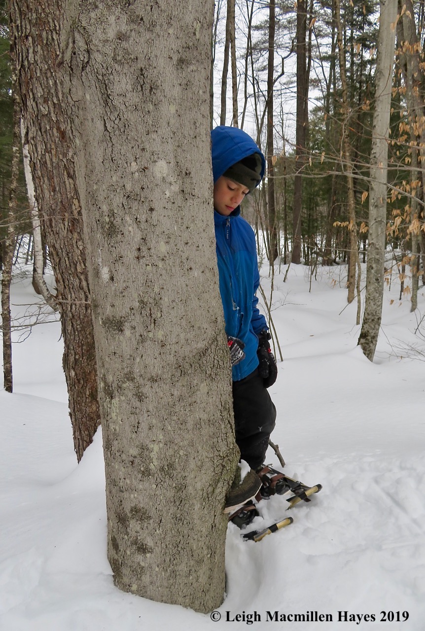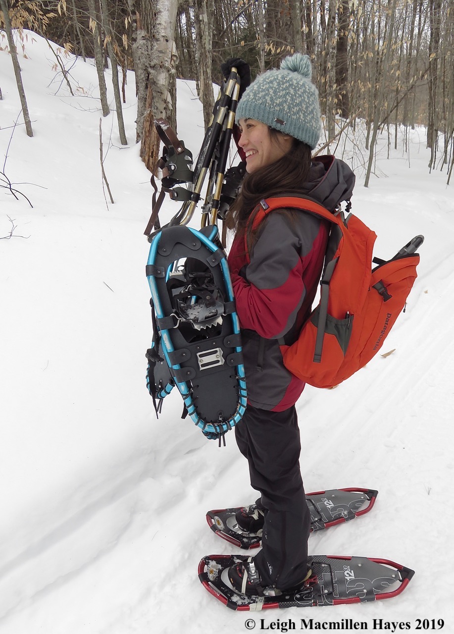 As we walked, I kept pointing out Porcupine tracks and if we’d had snowshoes on, I might have convinced her to look for the feeding trees and den sights, but we chose to begin with micro-spikes and quickly ditched those since the snow conditions on the well-packed trail were just right.