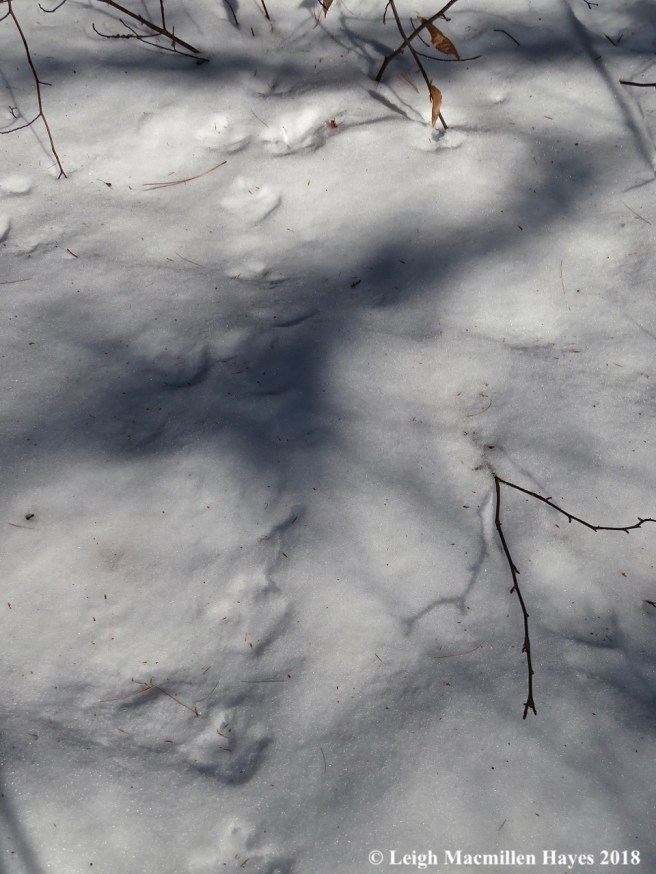 And then middens or garbage piles of Balsam Fir cone scales started to appear and we knew that a Red Squirrel had been dining. We saw some tracks, but never actually heard a squirrel, red or gray, though a Chipmunk dash across the snow and hid from us.