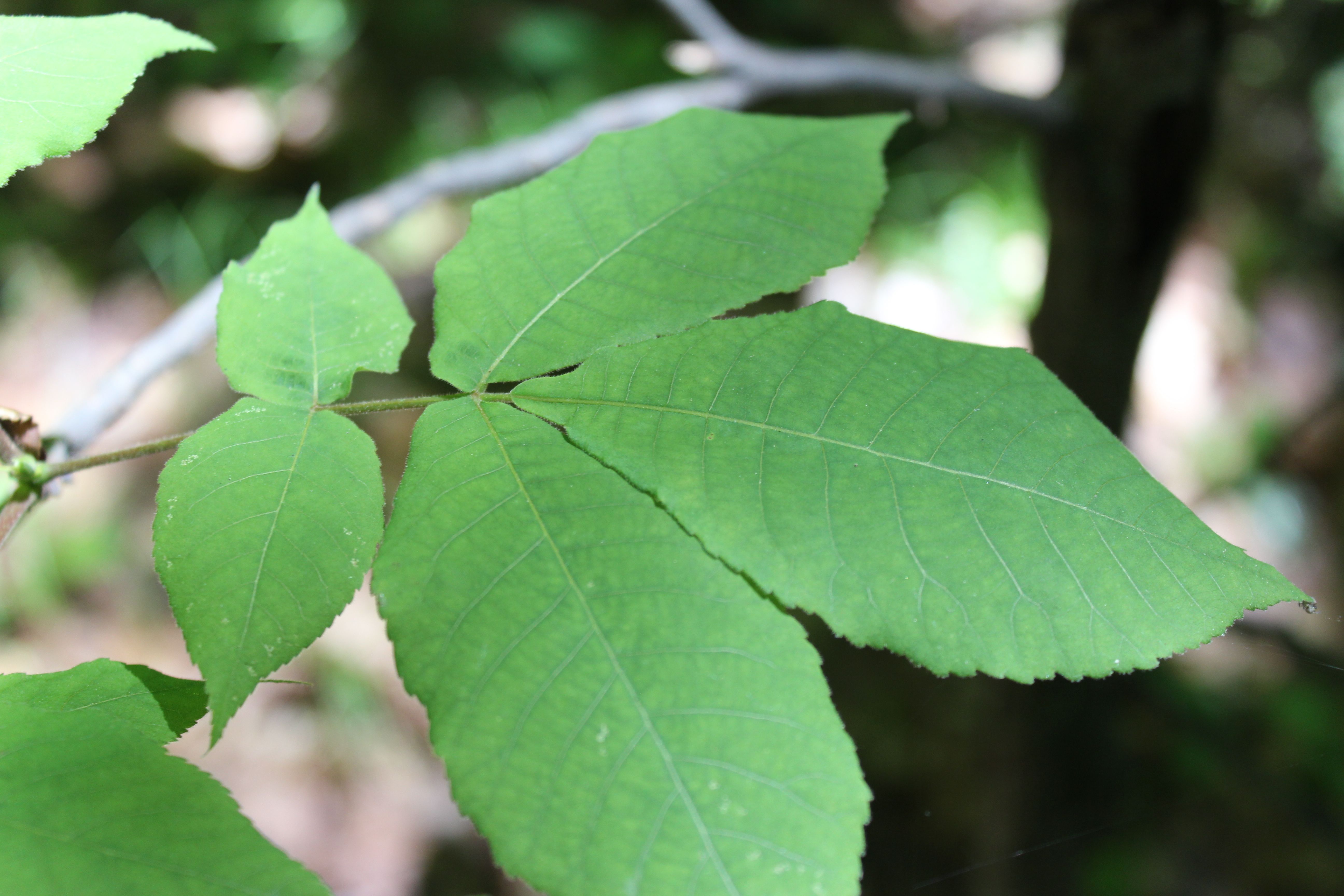 Its alternate leaves are compound, consisting of five serrated leaflets usually (sometimes there are seven).