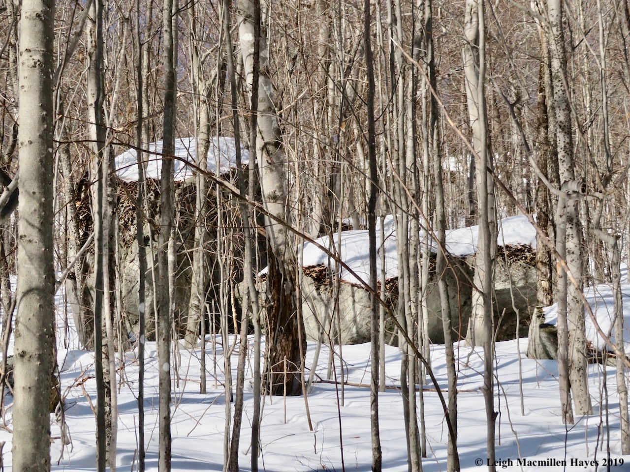 Once the trail leveled off, we started looking around. And being winter with no leaves to distract one’s view, the snow-topped boulders stood out like tiny homes in the woods.