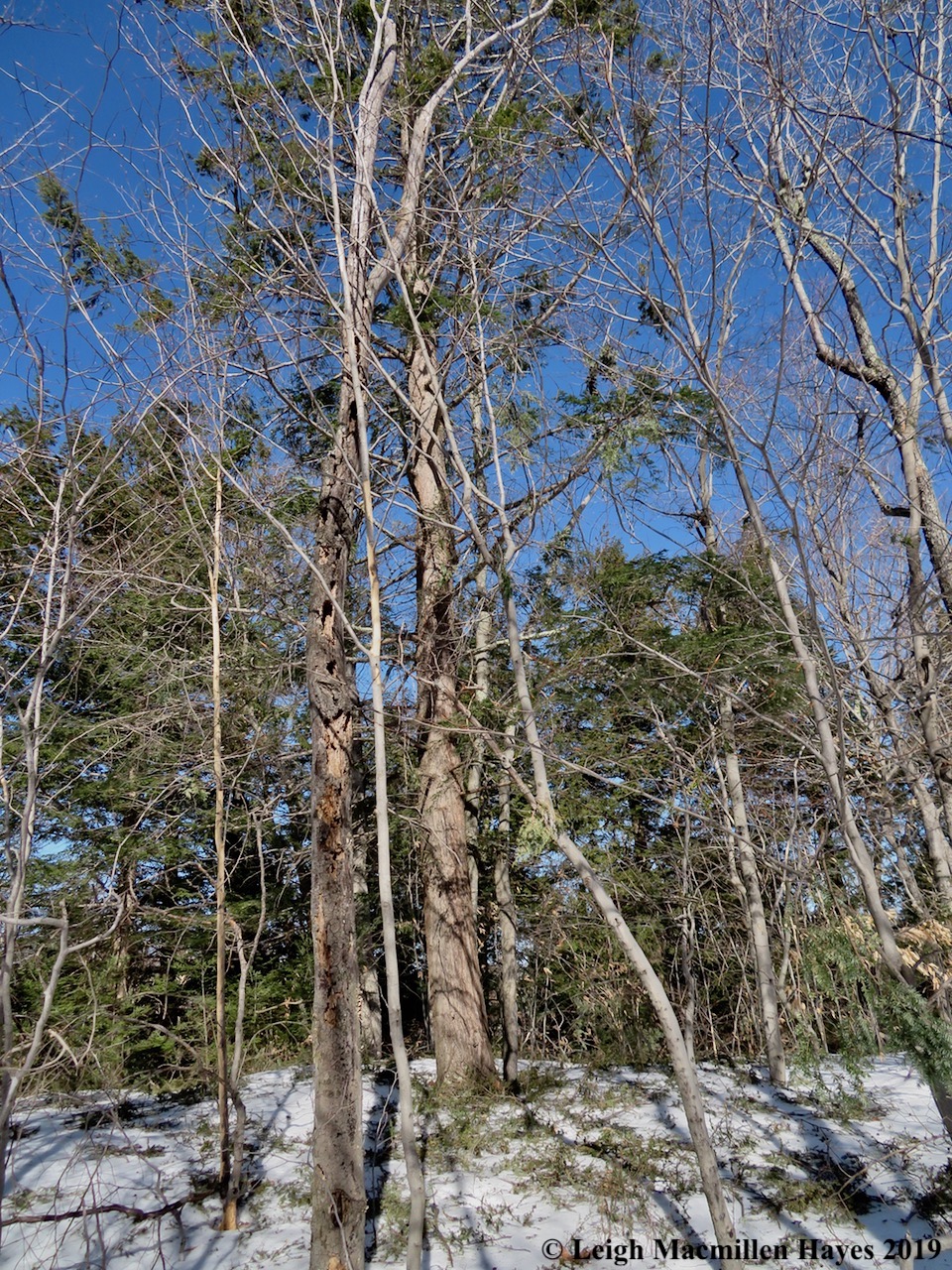 The bark on the big old hemlock, however, had flaked off revealing its cinnamon color beneath for the porcupine had created a regular climbing route.