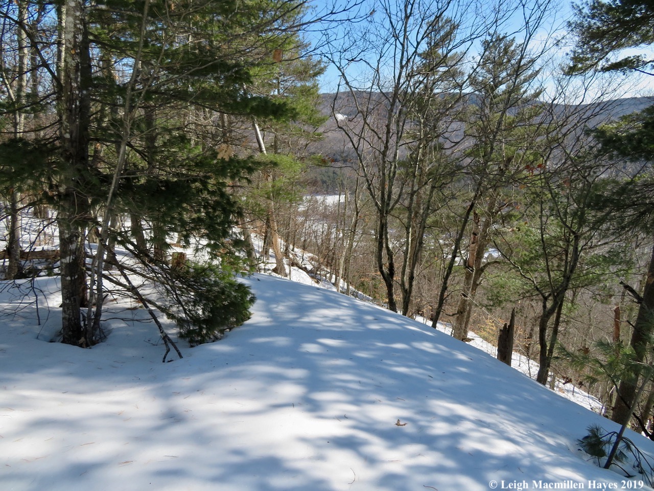 There was no wind and the sun felt delightful–so we sat for a bit taking in the view of the ponds below and Pleasant Mountain with Shawnee Peak Ski Area in the distance.