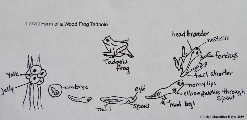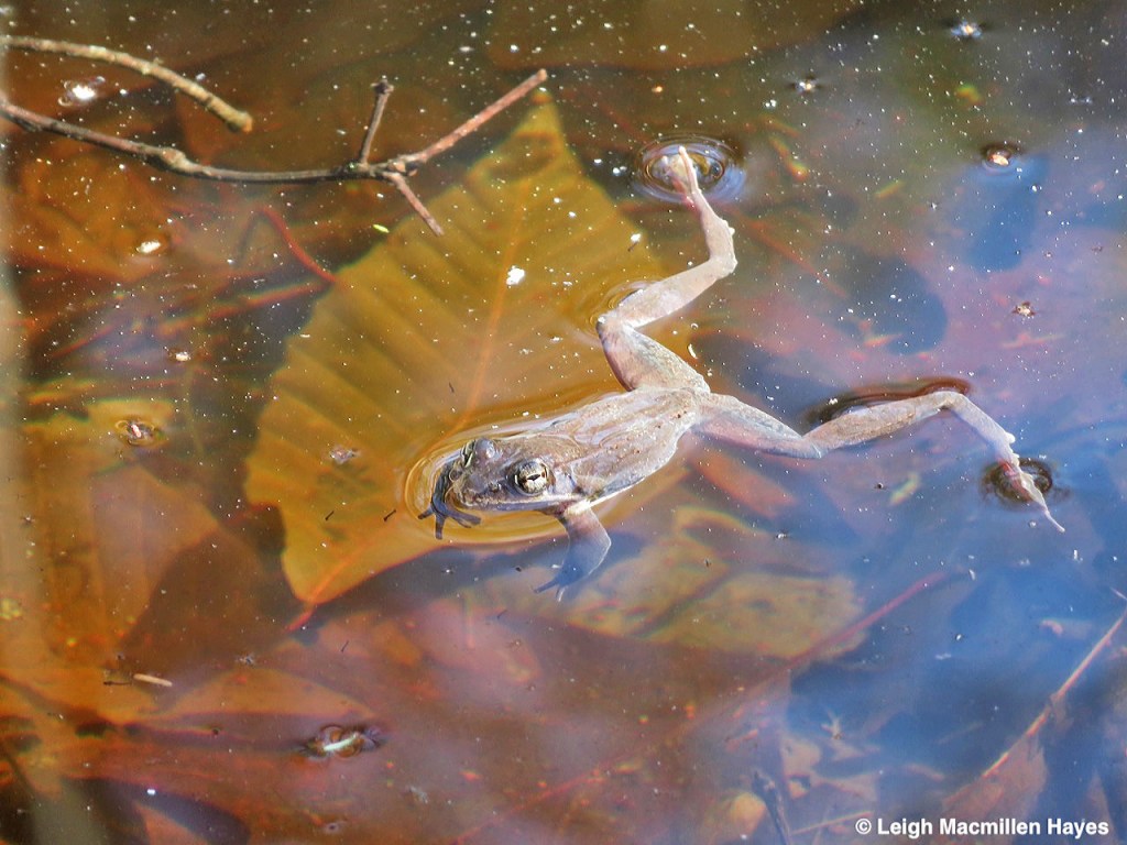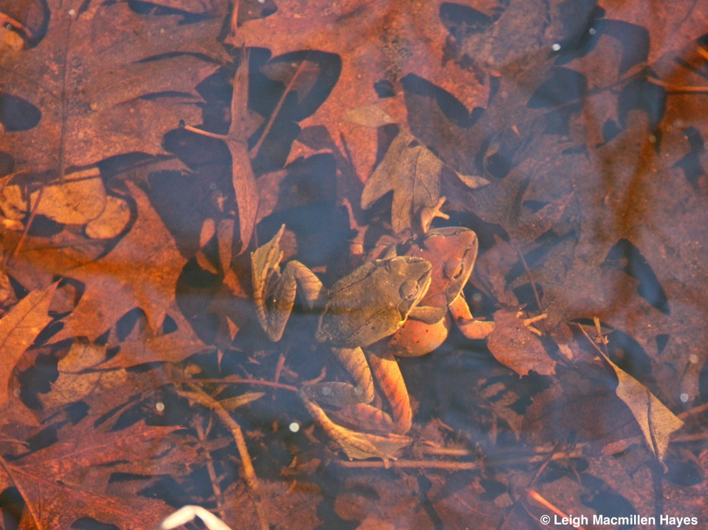 And no sooner has the ice gone out, when upon my approach I hear “Wruck, wruck,” and know that the Wood Frogs have returned to their natal breeding grounds. At first, they dive as soon as they hear me approach. But I stand still, sometimes for up to fifteen minutes, and ever so slowly, one by one, they rise to the surface and float.