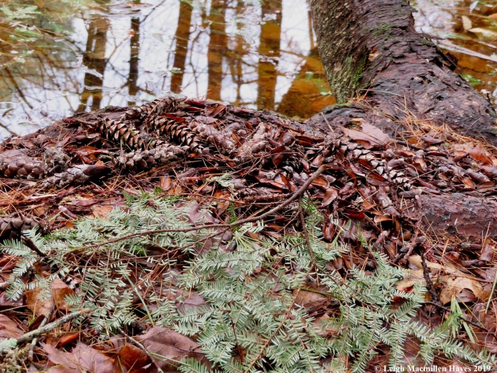 Pine and hemlock needles and branches from winter storms coat the ice as it slowly begins to melt along the edge of the pool, providing a glimpse of the sunken leaves below, where life awaits.