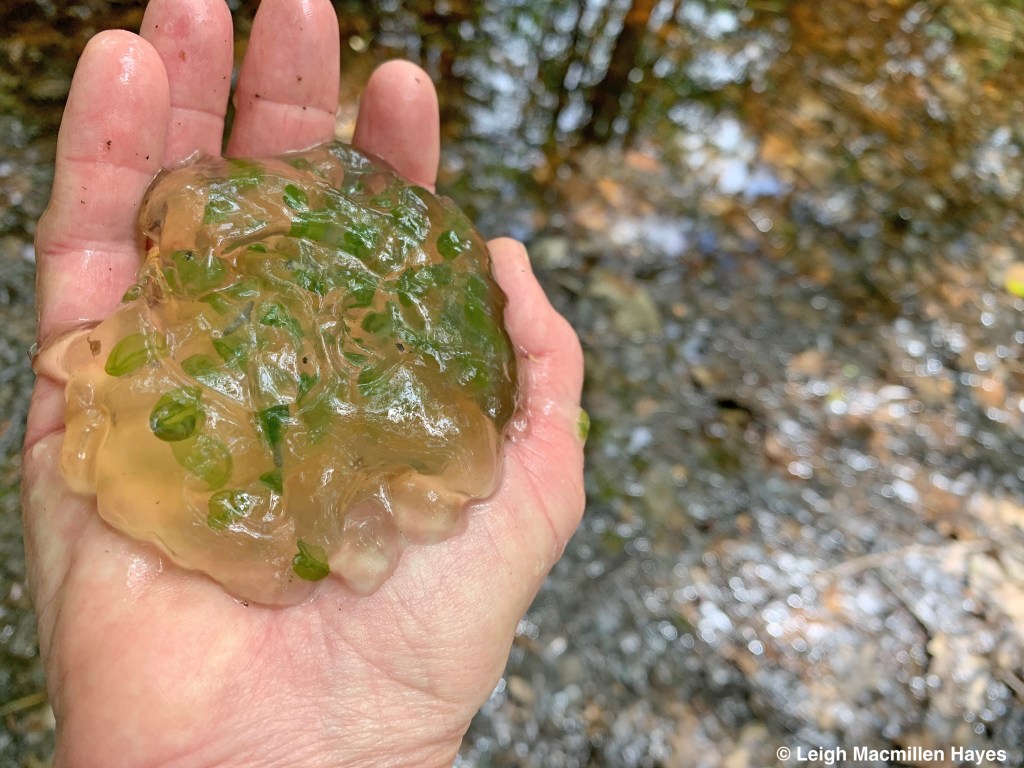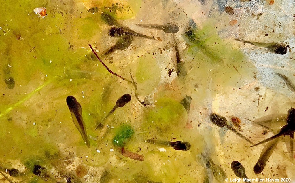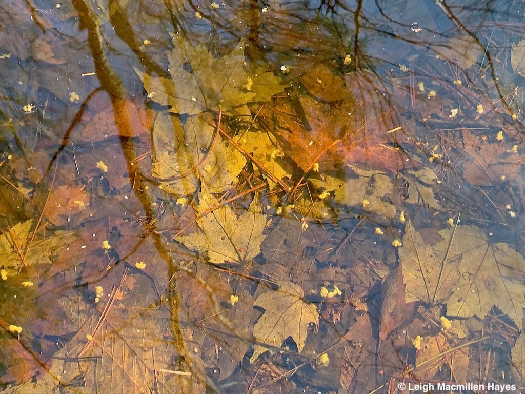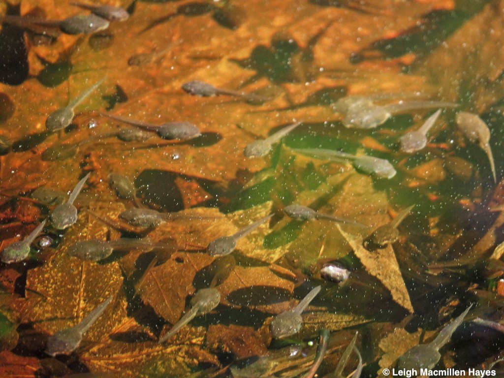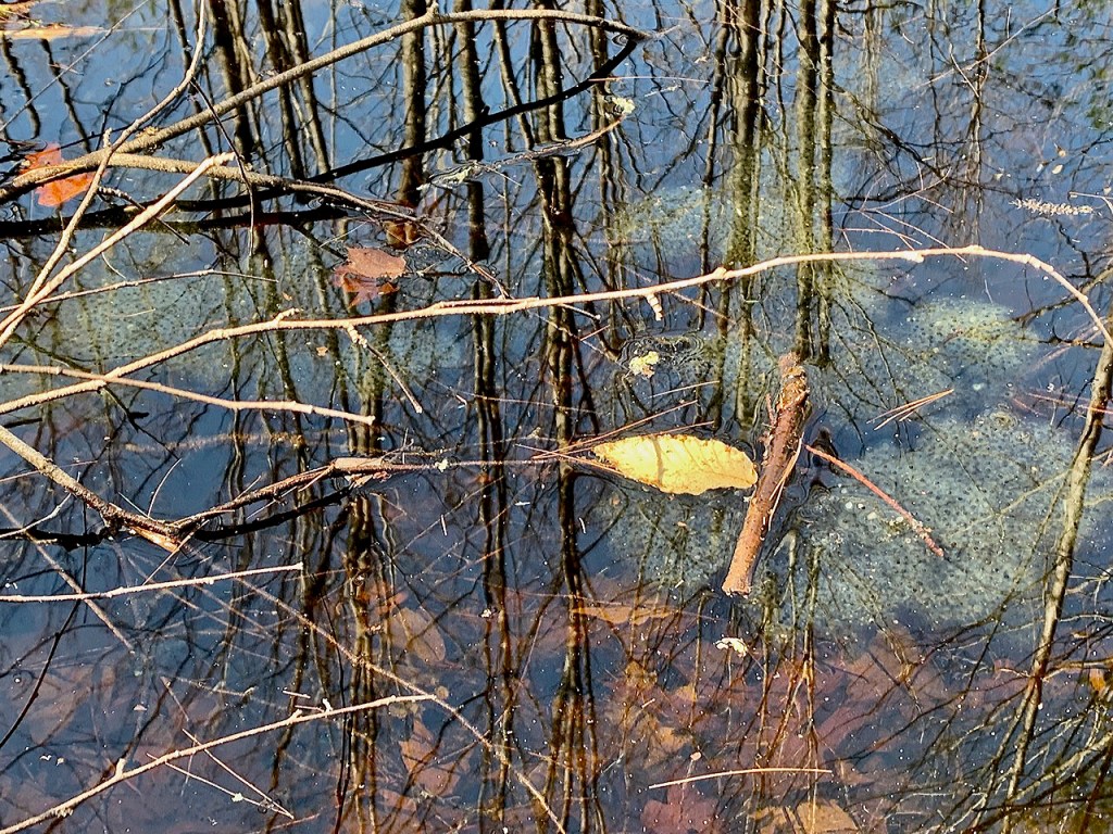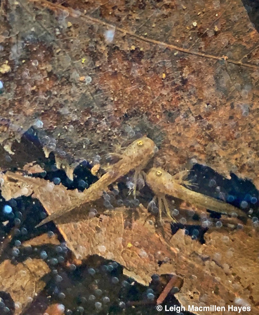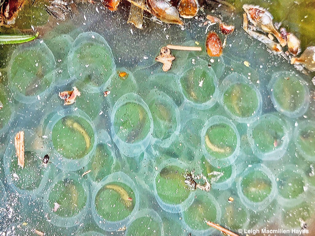 A few weeks later, looking deep into the pool, which isn’t really all that deep, I notice blobs of eggs clustered together in a mass that has a tapioca-like shape to it and notice little life forms moving about in the shape of tadpoles. I feel like a proud momma. The thing is, the Wood Frogs mate, she lays eggs he’s fertilized and within two weeks, the parents are long gone, back to their woodland setting. And so I do feel protective parent–or maybe foster parent–keeping watch and celebrating achievements.