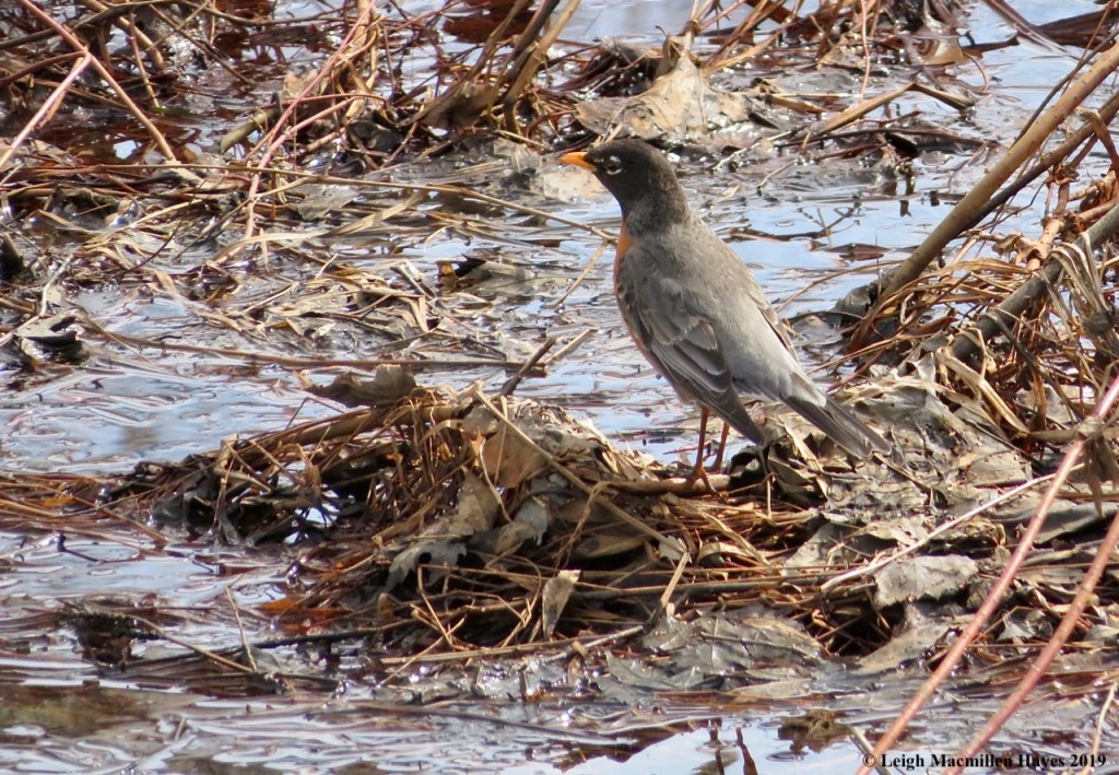 And roaming about in and out of the water was an American Robin. I used to think these birds were harbingers of spring, but all winter I’ve spied them in various places. This one cuck, cucked as it moved, and poked and sipped. Eventually, another responded.