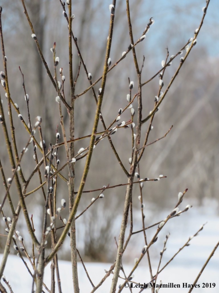 For a while I managed to cross the wet spots determined to see what other harbingers of spring might speak to me. While admiring some pussy willows, I heard the whispering sound of Wood Ducks and several times startled them so they took to the air as is their nervous habit.