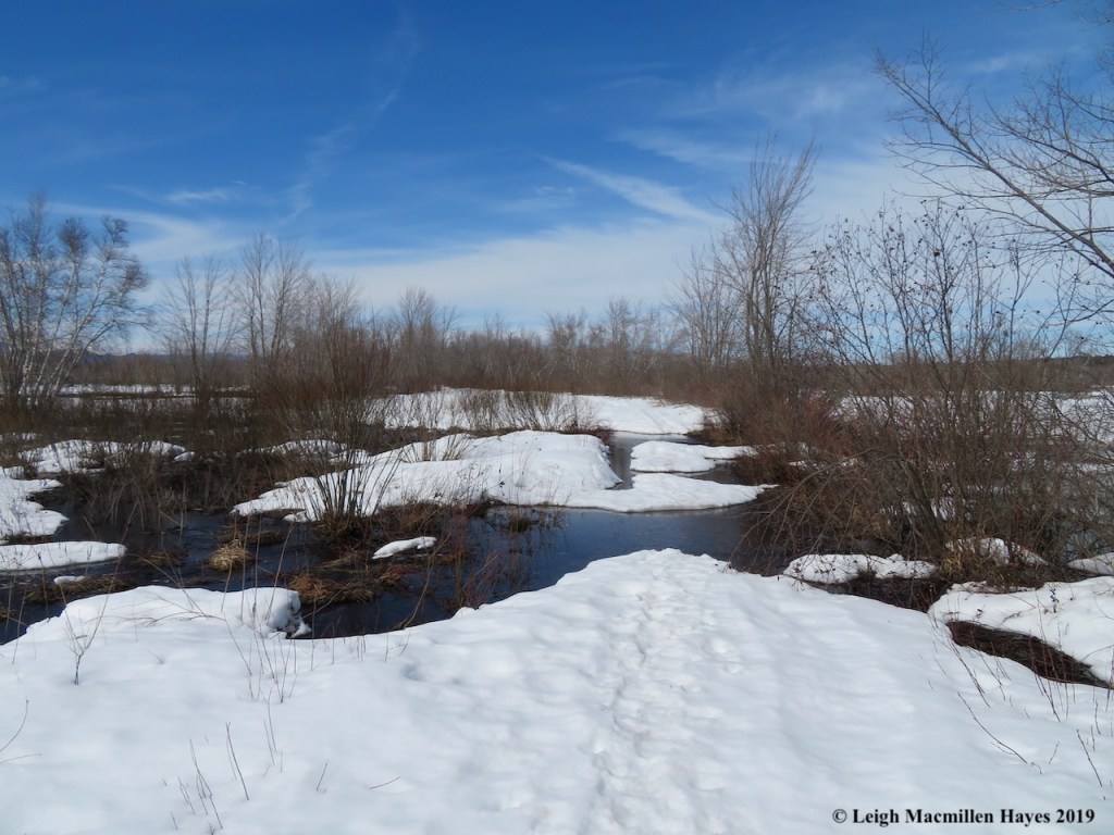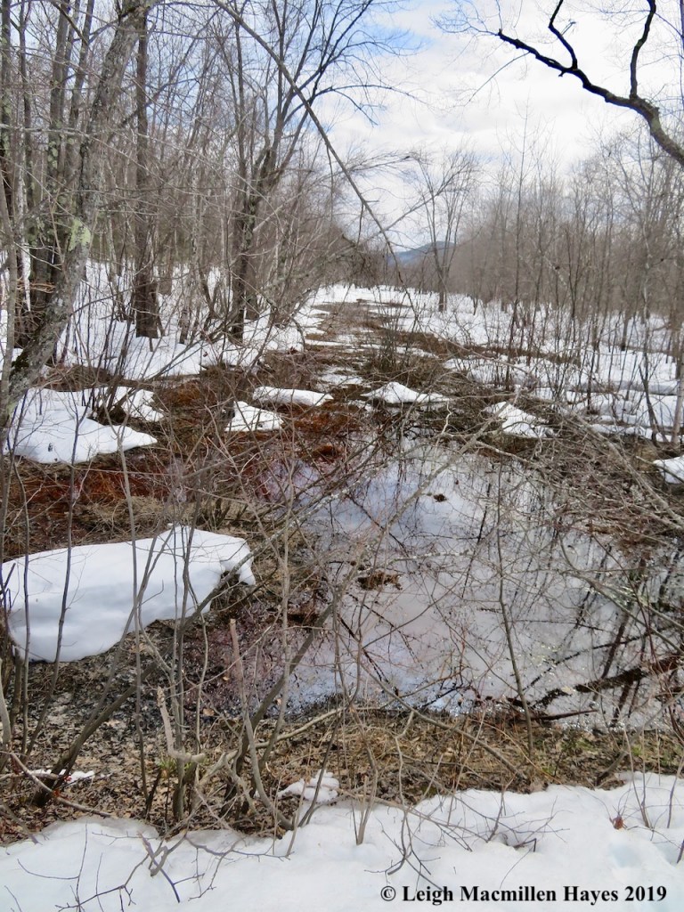 A little further along, the melt down was officially underway. Not only by the sight of water, but in its still form I recognized the musty, muddy smell. New Haven Harbor at low tide came instantly to mind.