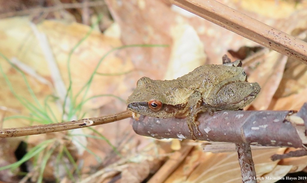 And my playful spirit did what it often does when spotting this species. I found a small stick and poked the little puff balls, which released its spores in a smoke-like manner. I can’t show you the action, but you can see the results of the dried salmony-brown spores atop some of the now-deflated brown balls.