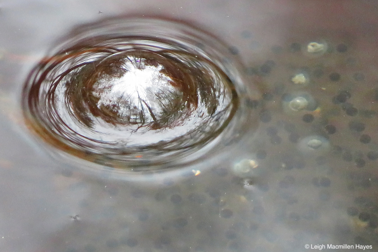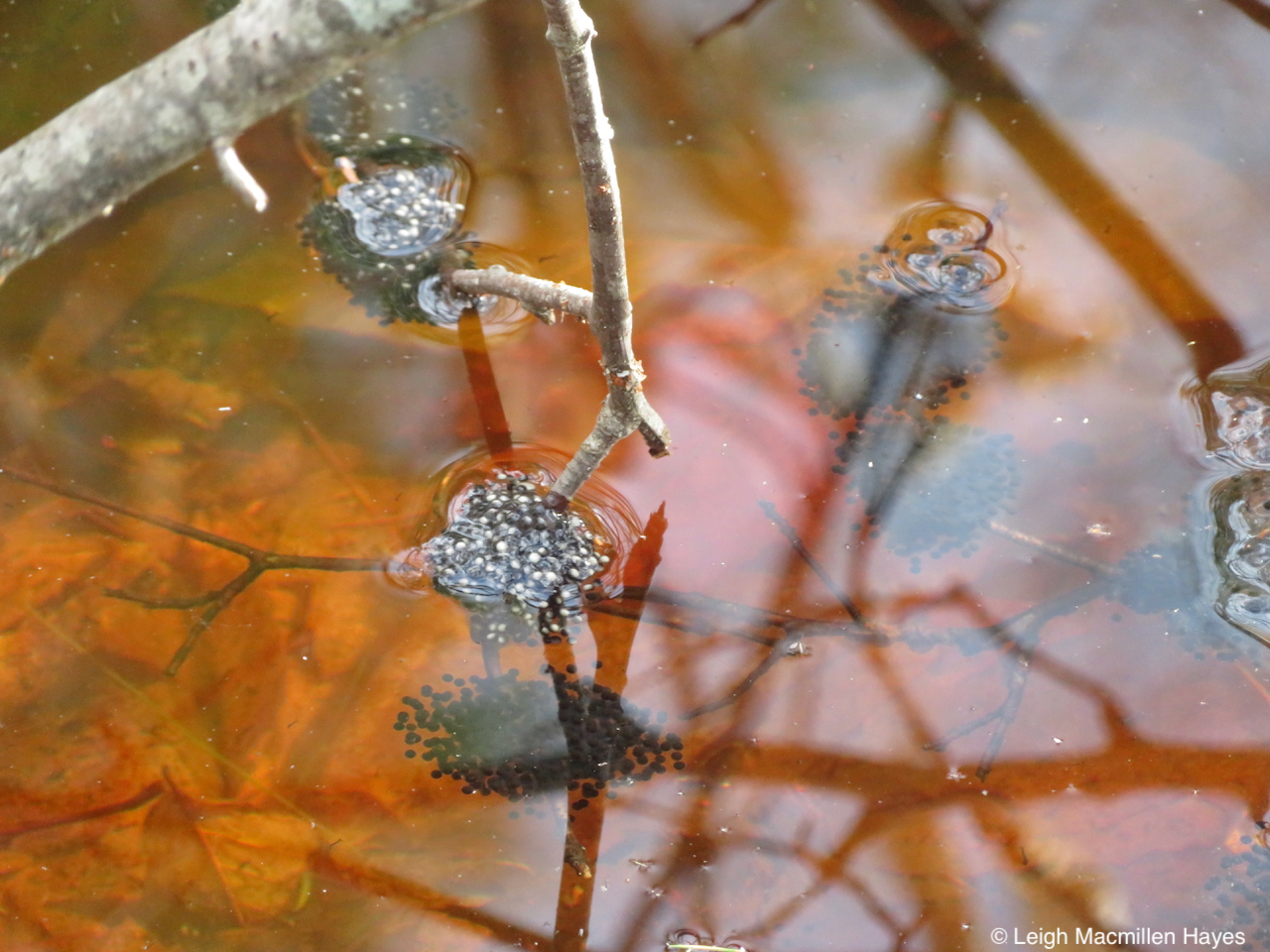 A few weeks later, looking deep into the pool, which isn’t really all that deep, I notice blobs of eggs clustered together in a mass that has a tapioca-like shape to it and notice little life forms moving about in the shape of tadpoles. I feel like a proud momma. The thing is, the Wood Frogs mate, she lays eggs he’s fertilized and within two weeks, the parents are long gone, back to their woodland setting. And so I do feel protective parent–or maybe foster parent–keeping watch and celebrating achievements.