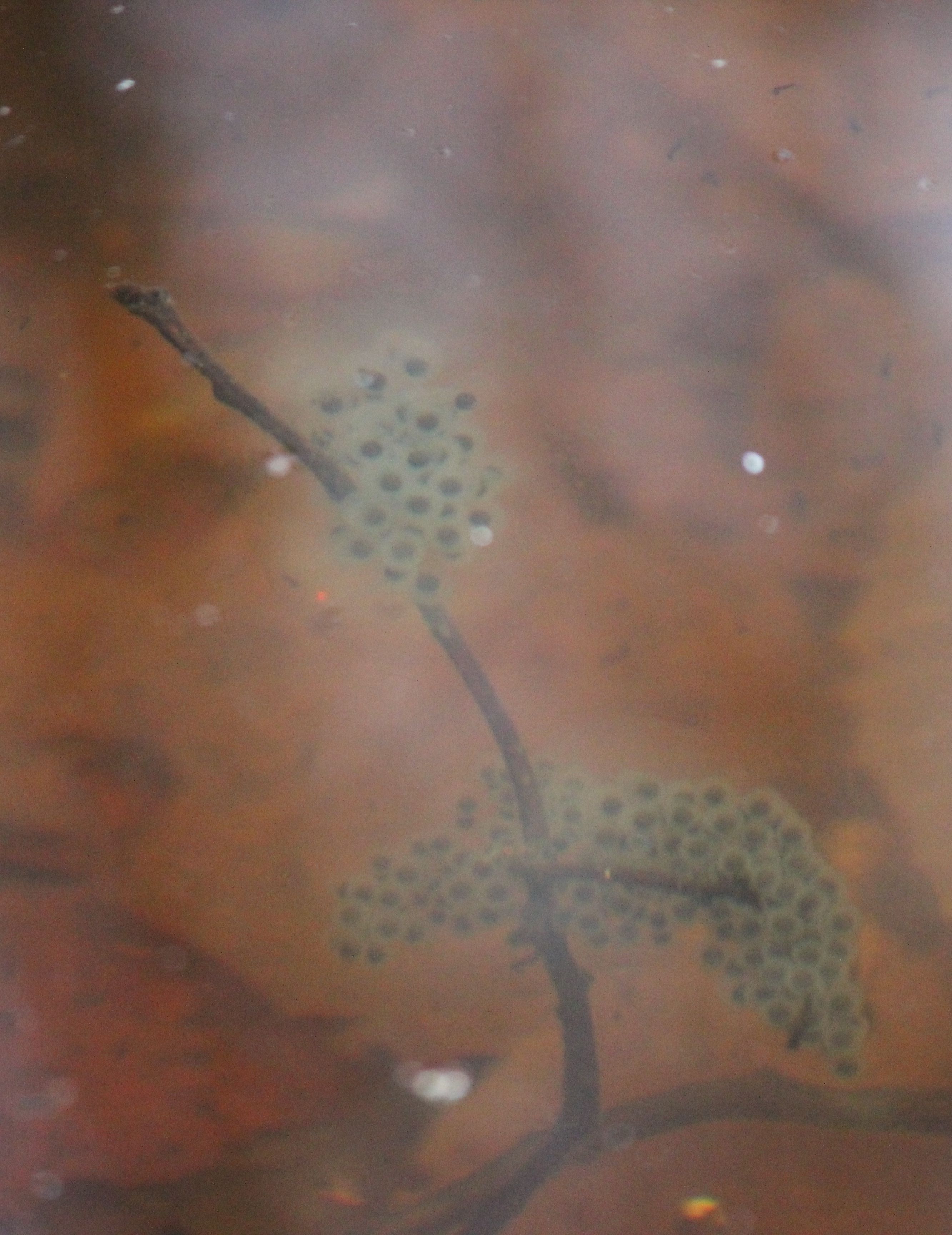 A few weeks later, looking deep into the pool, which isn’t really all that deep, I notice blobs of eggs clustered together in a mass that has a tapioca-like shape to it and notice little life forms moving about in the shape of tadpoles. I feel like a proud momma. The thing is, the Wood Frogs mate, she lays eggs he’s fertilized and within two weeks, the parents are long gone, back to their woodland setting. And so I do feel protective parent–or maybe foster parent–keeping watch and celebrating achievements.